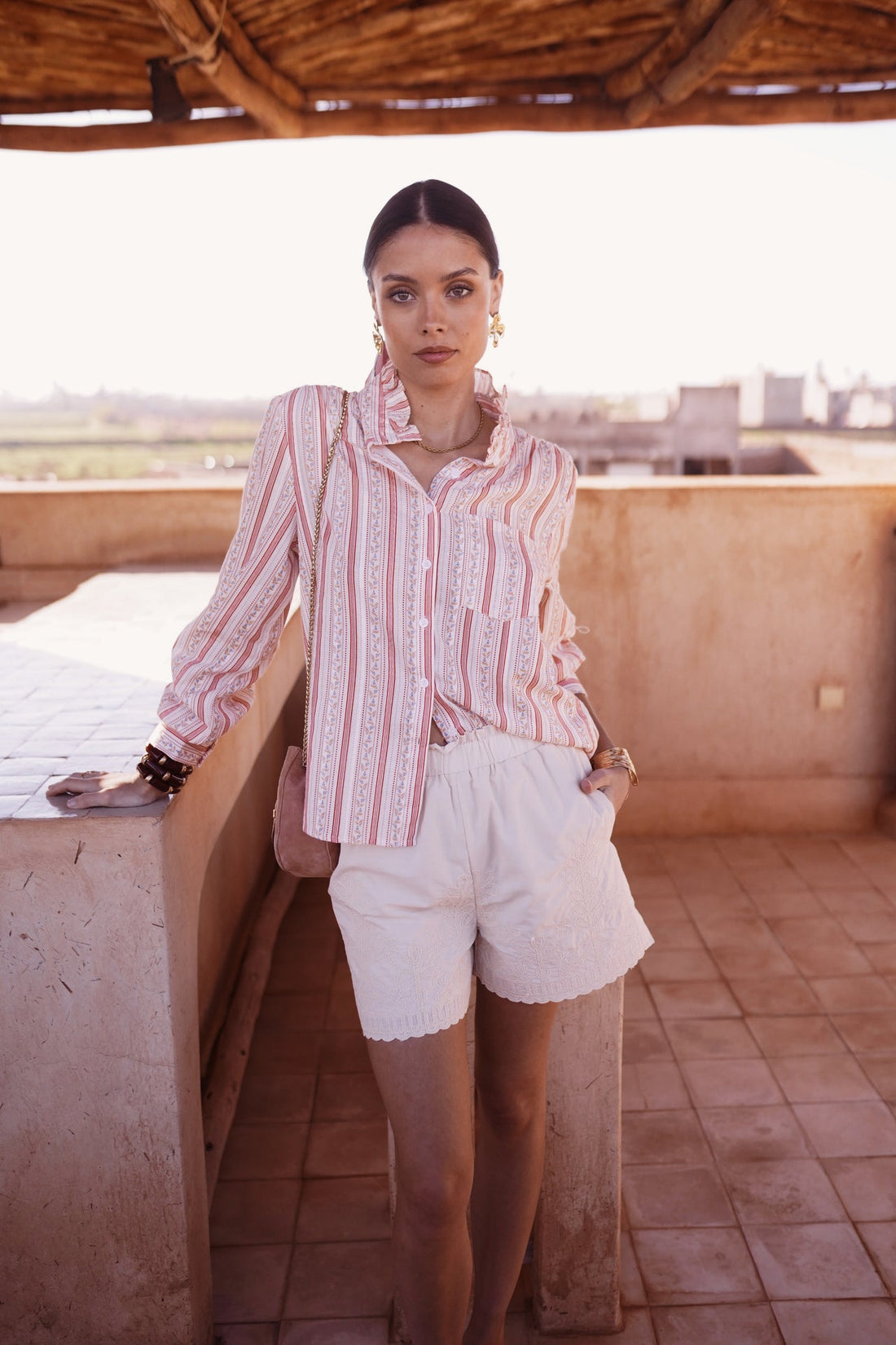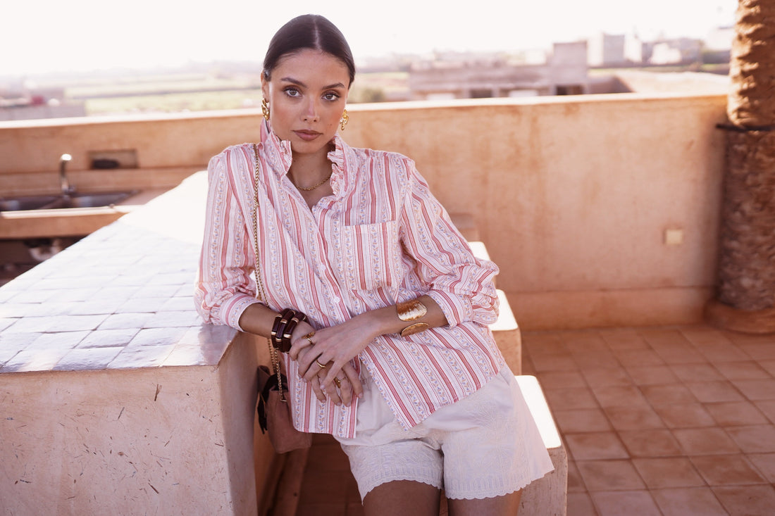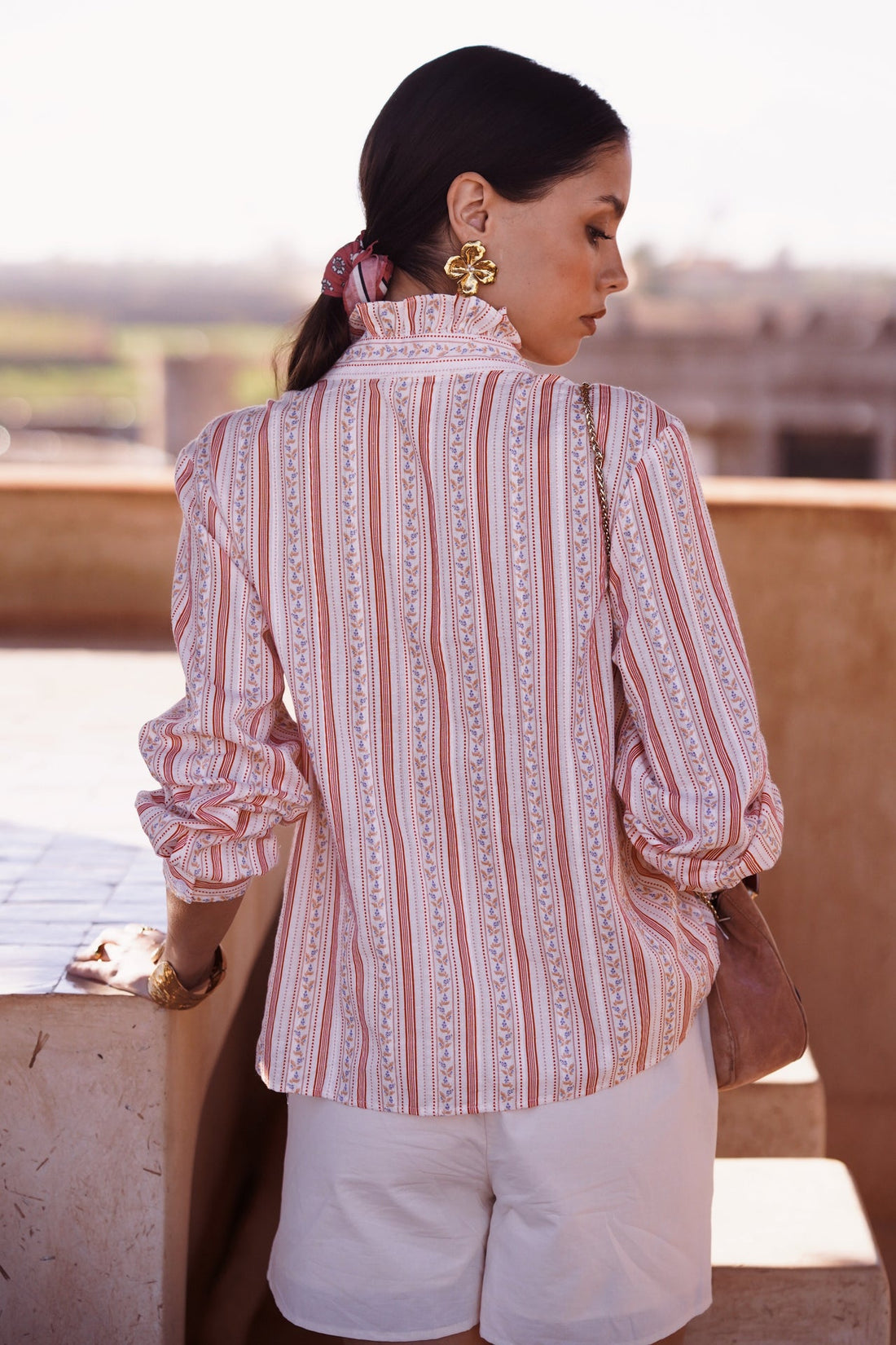 La Chemise Imane séduit par son allure délicate et ses rayures fines qui apportent une touche de fraîcheur à la silhouette. Son col légèrement volanté et ses détails soignés en font une pièce à la fois élégante et féminine.