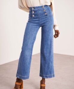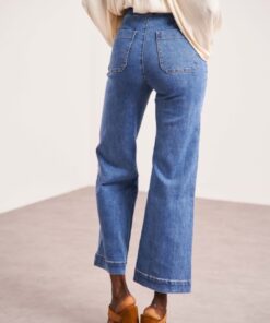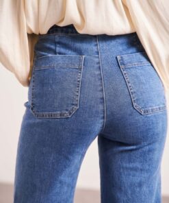 Le Jeans EMY, taille haute en coupe FLARE coupé à la cheville. Ce jean au style ample, chic et confortable a un effet jambe longue.