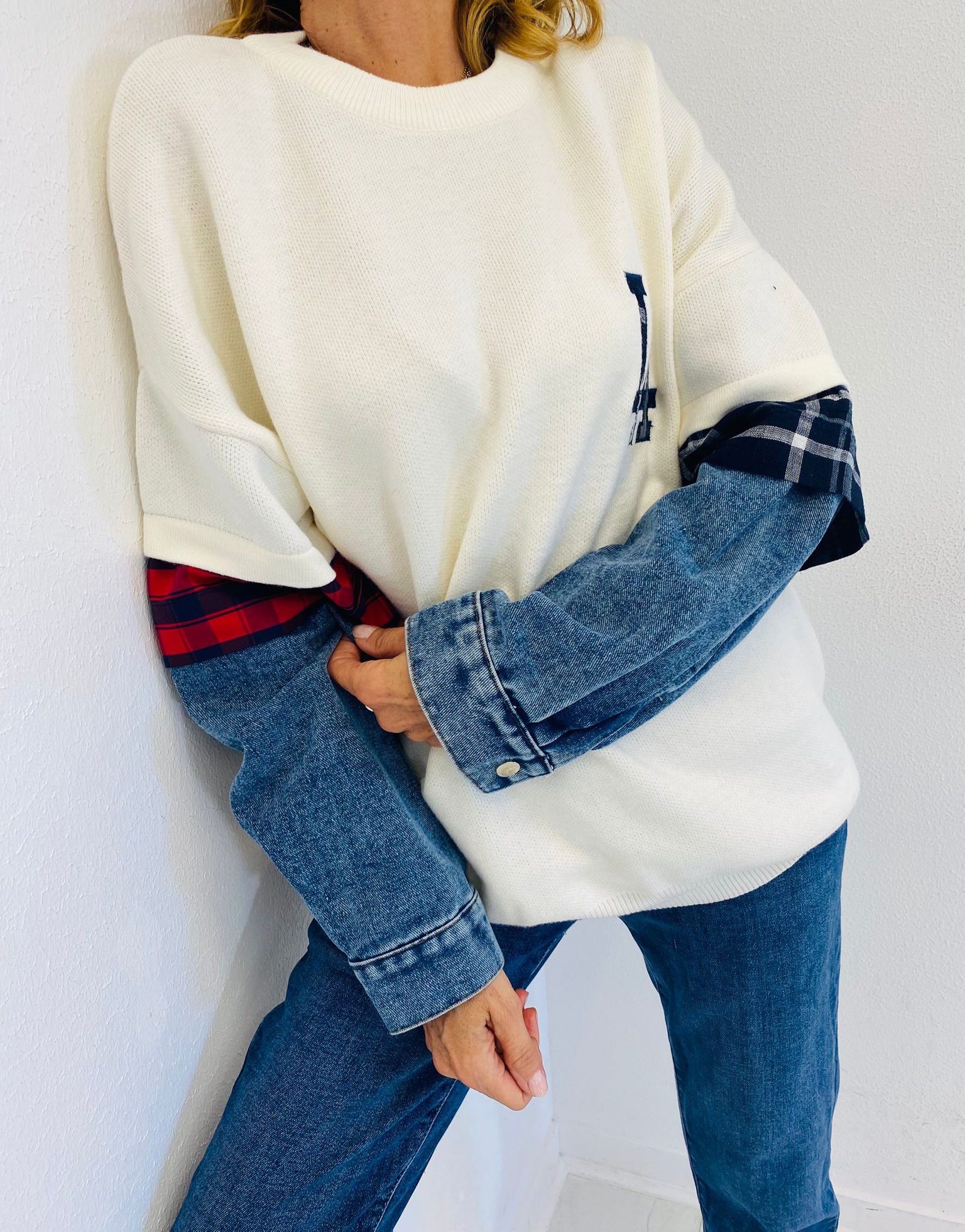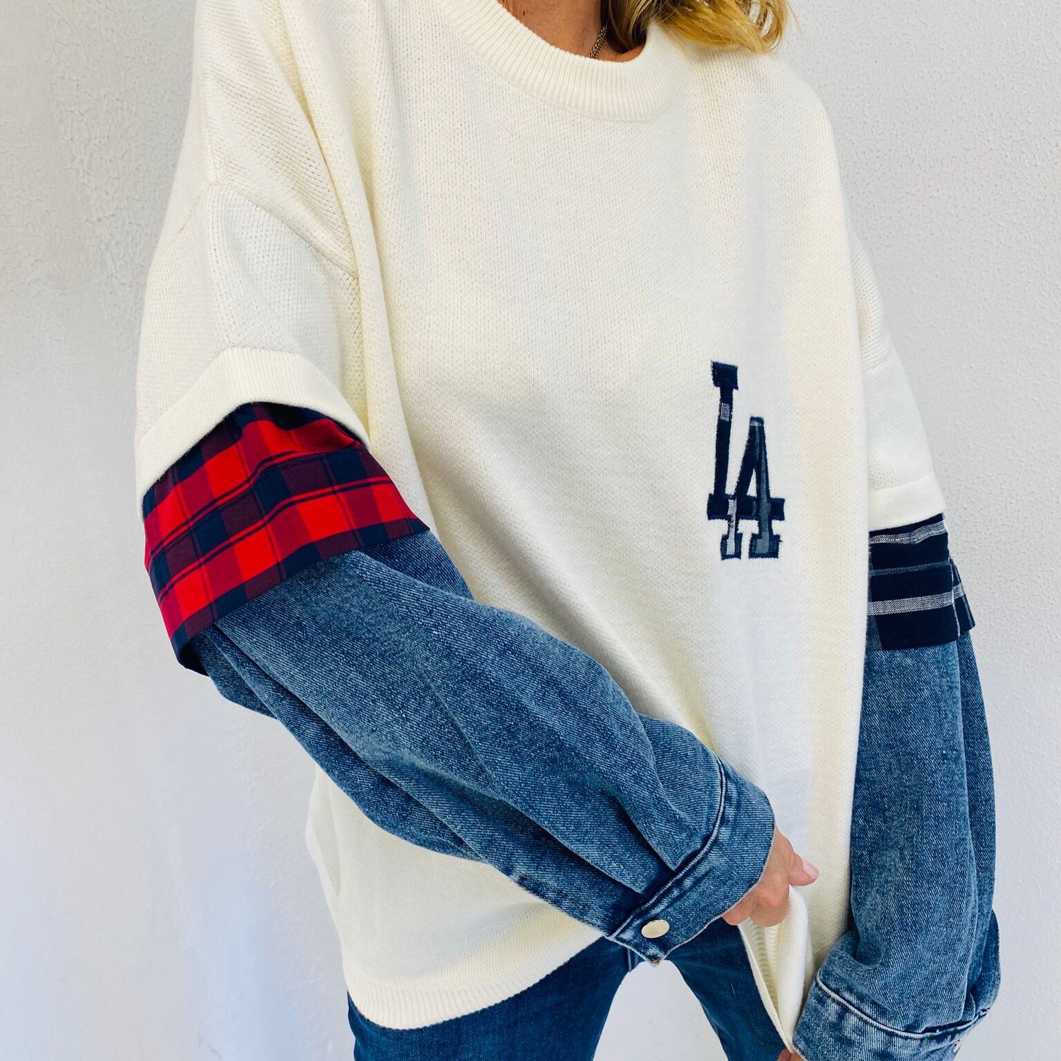 Le Pull Los Angeles est une pièce tendance qui allie confort et originalité. Sa coupe oversize et ses manches contrastées en jean et carreaux apportent une touche urbaine et moderne, parfaite pour se démarquer avec style.