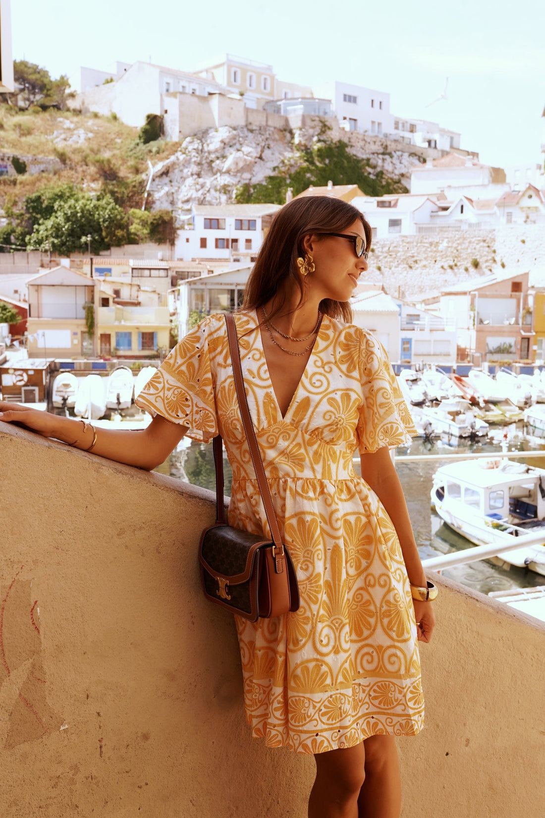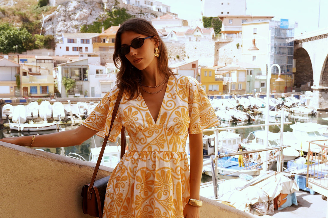La Robe Lumen incarne la lumière et la douceur des vacances. Son imprimé jaune safran aux accents rétro, posé sur un fond blanc lumineux, apporte une touche solaire et élégante à votre silhouette.