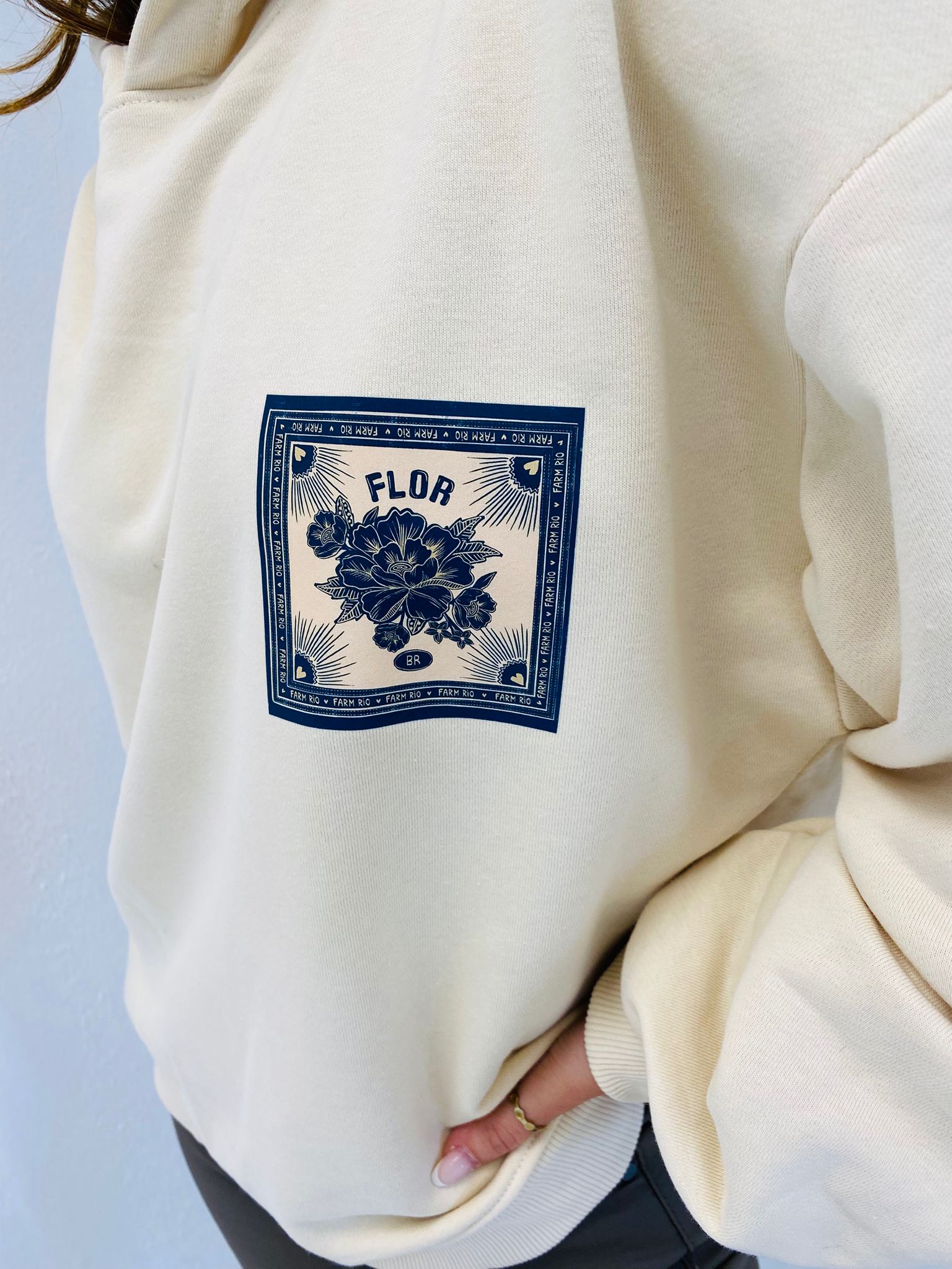 Son imprimé graphique effet cadre, inspiré d’un motif floral aux nuances bleutées, apporte une touche originale et élégante qui attire le regard. Le contraste entre le fond écru et le visuel bleu profond donne du caractère à ce modèle tout en restant facile à associer.